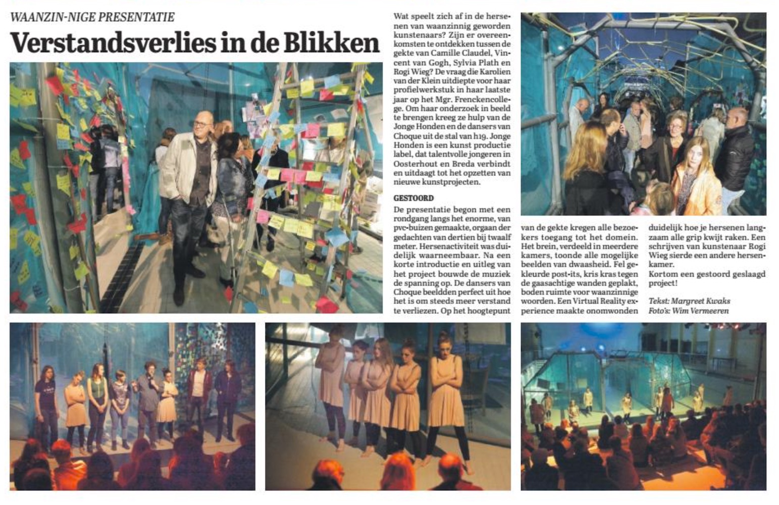 Waanzin-nige presentatie: Verstandsverlies in de BlikkenWat speelt zicht af in de hersenen van waanzinnig geworden kunstenaars? Zijn er overeenkomsten te ontdekken tussen de gekte van Camille Claudel, Vincent van Gogh, Sylvia Plath en Rogi Wieg? De vraag die Karolien van der Klein uitdiepte voor haar profielwerkstuk in haar laatste jaar op het Mgr. Frenckencollege.
